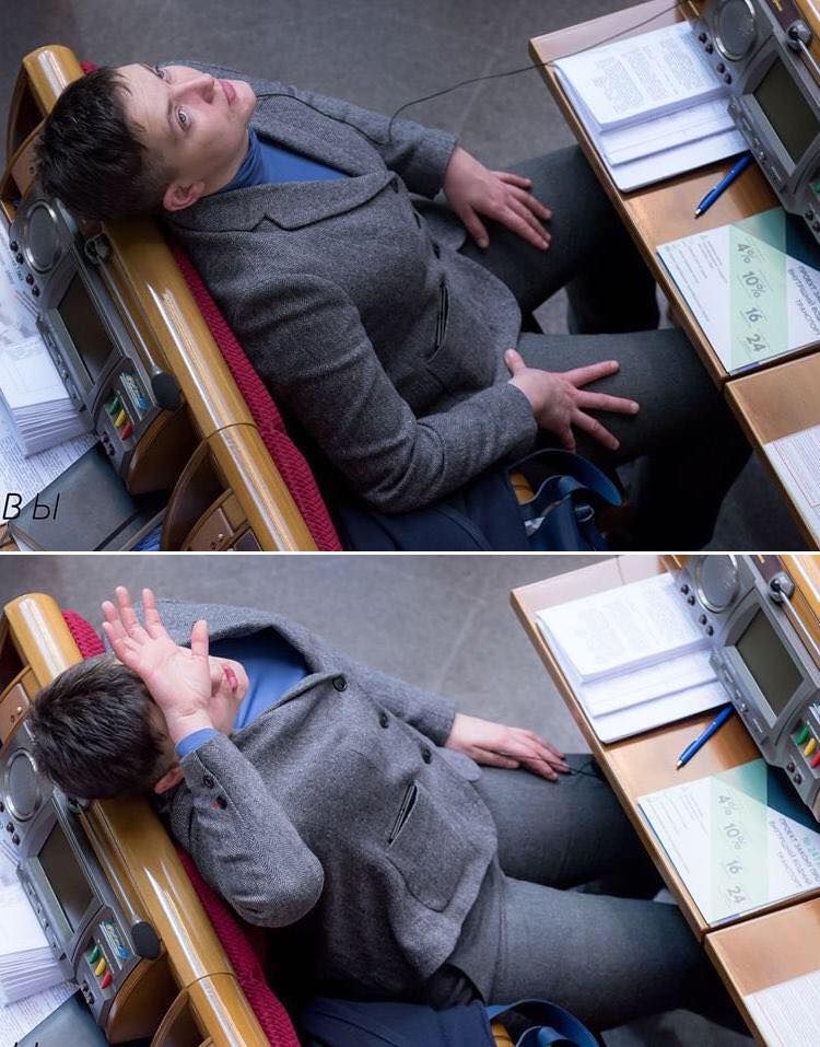 Депутата Верховной рады Надежду Савченко высмеяли в Сети из-за странного поведения на одном из заседаний. Фотографии парламентария опубликовал украинский политолог Алексей Голобуцкий в Facebook.