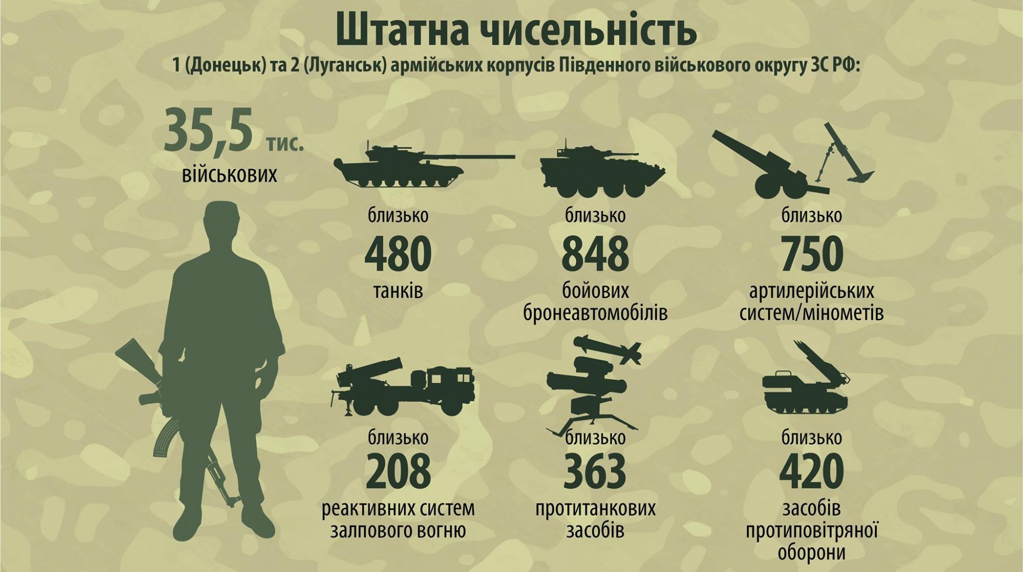 «За даними МВС на тимчасово окупованій території Донбасу воюють корпуса 8 армії Південного округу армії РФ. Склад цих сил 35, 5 тисяч, в їх арсеналі 478 танків, 848 бронемашин, 750 артилерійських машин, РСЗВ 208, протитанкових засобів 363, 419 ‑ протиповітряної оборони. Бойовики не можуть мати такі потужності, вони цю зброю не в воєнторзі придбали», ‑ зазначив міністр.