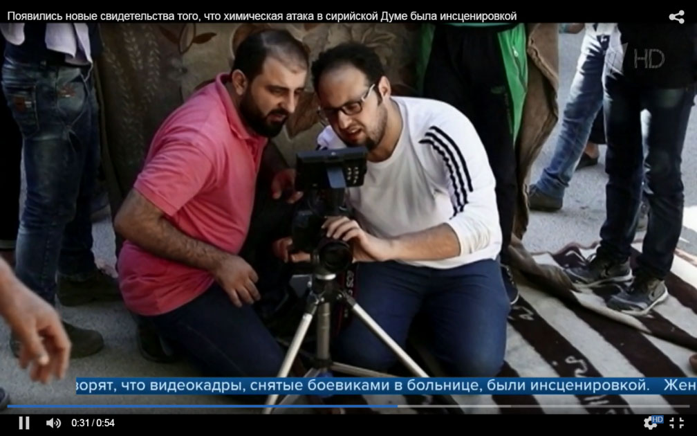 То же самое показали в выпуске «Вестей недели» с Дмитрием Киселёвым в тот же день. Однако репортаж на «России 1» содержит заявления Фареса Муххамада Майяса, которого журналисты назвали участником съёмочной группы, записавшей инсценировку химической атаки.