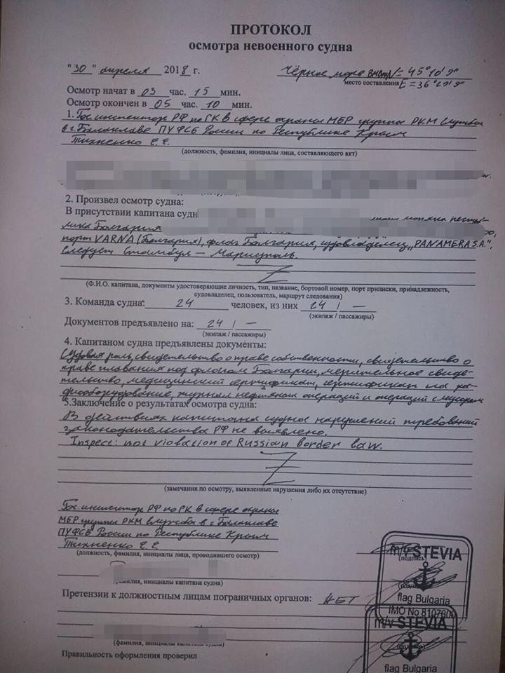 Например, во время оформления теплохода под флагом Мальты (среди экипажа: 16 граждан Украины и 2 гражданина Турции), направляющегося по маршруту Италия (Монфальконе) - Украина (Мариуполь) судно остановили во время прохождения Керченского пролива. Позже он был остановлен для повторного осмотра и идентификации членов суднокоманды.