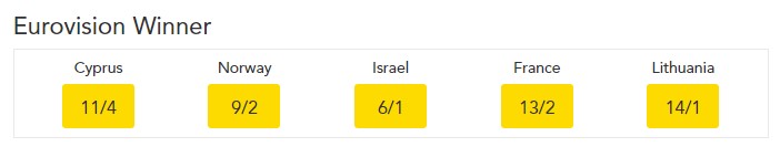 Главным фаворитом букмекеров на текущий момент является представительница Кипра - Элени Фурейра. Своим зажигательным выступлением и исполнением песни Fuego киприотка закрыла первый полуфинал конкурса.