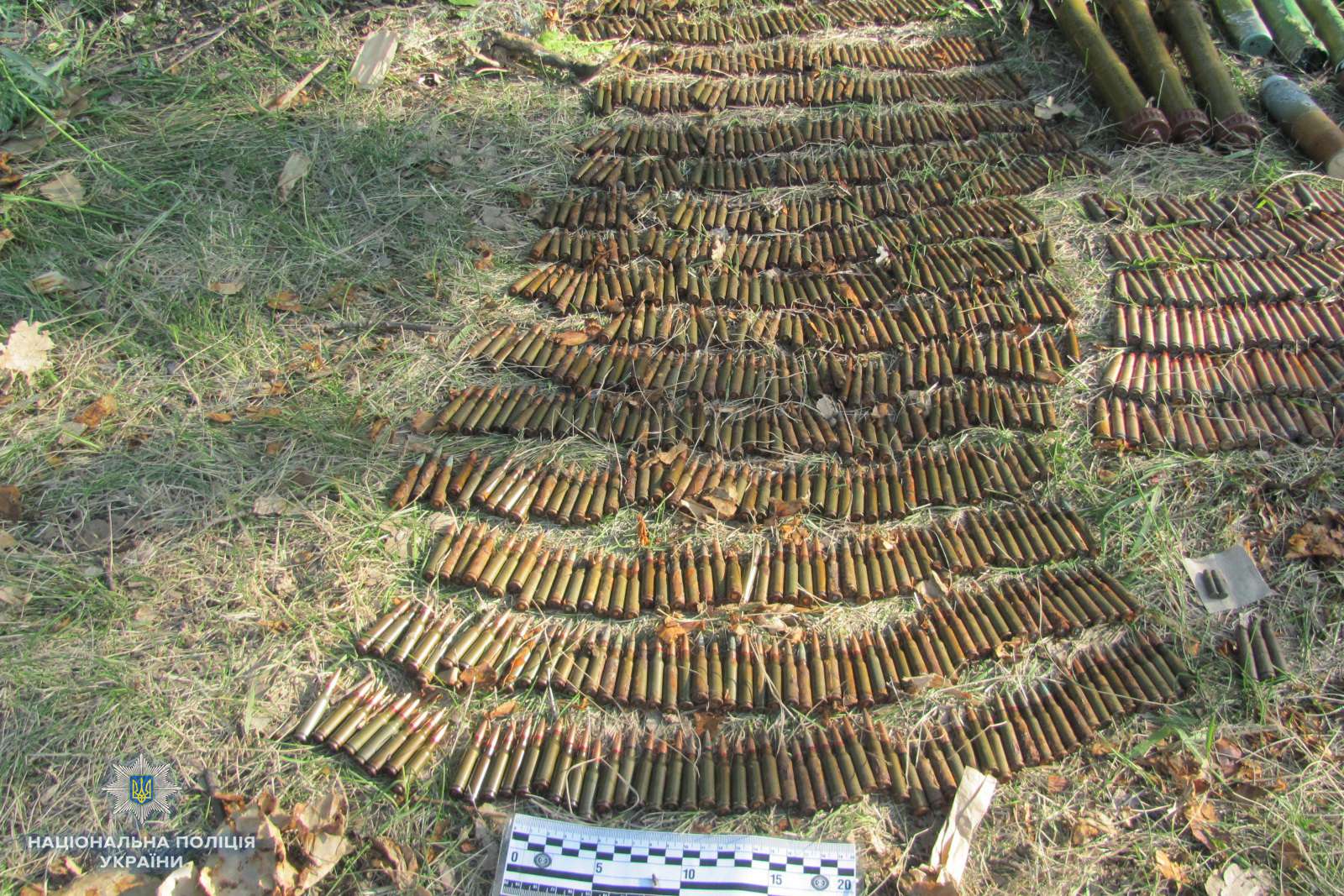 З місця знахідки було вилучено: три ПГ-7С, димова шашка, освітлювальна міна СМ11, три артснаряди, 30 УЗРГМ, 8 запалів УДЗ, 40 ВОГ 25, 12 гранат Ф1 без запалу, 19 гранат РГД-5 без запалу, граната РГО без запалу, 7 гранат РГН без запалу, 7,7 тисяч патронів, 28 рейок з патронами 5,45 мм в кожній по 15 патронів, 7 пустих магазинів до кулемету, 3 пустих магазина з АК, 2 магазина 7,62 мм з 30 патронами, 3 магазина з 30 патронами 5,45 мм, постріли РПГ.