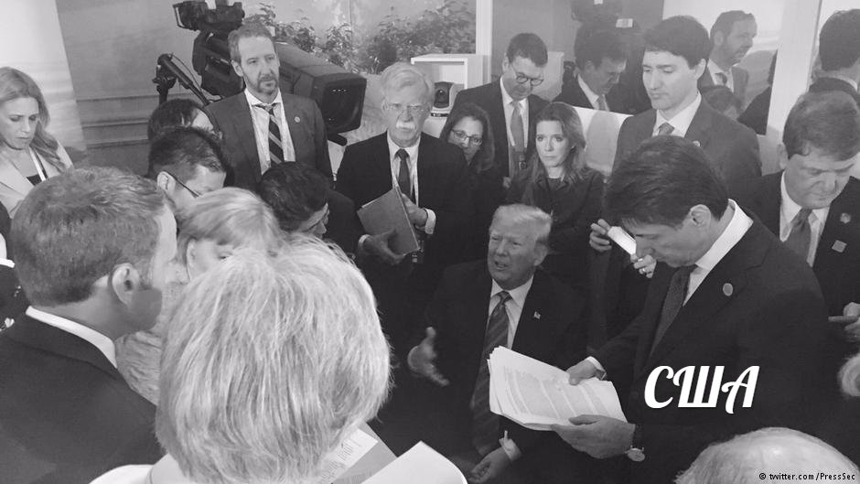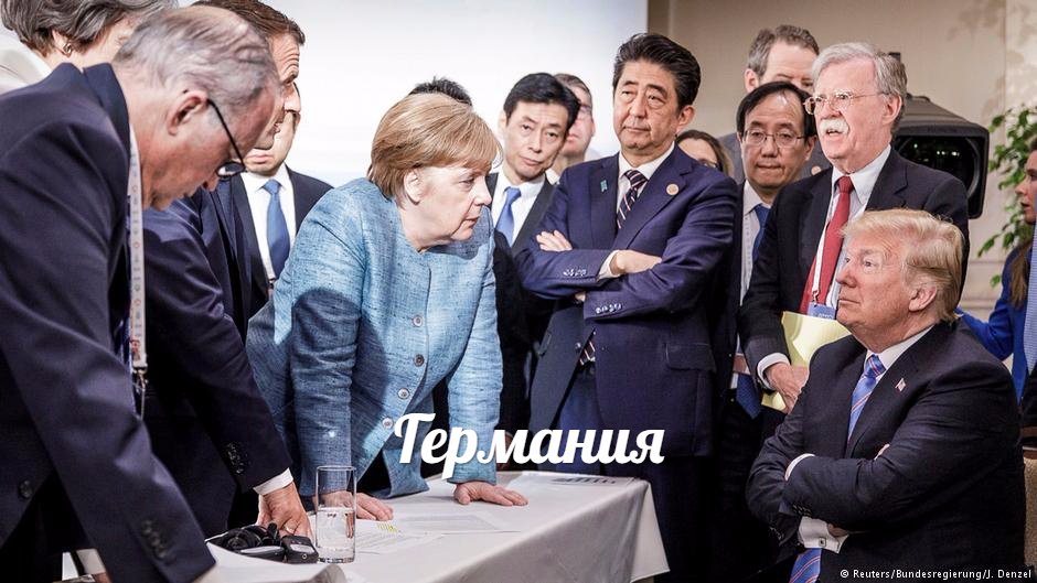 На фотографии главы Германии, Франции, Японии, Италии, Канады и Великобритании стоят вокруг президента США, который сидит, скрестив руки, при этом видно, как Меркель смотрит на Трампа сверху вниз, словно пытаясь надавить и убедить его в чём-то.