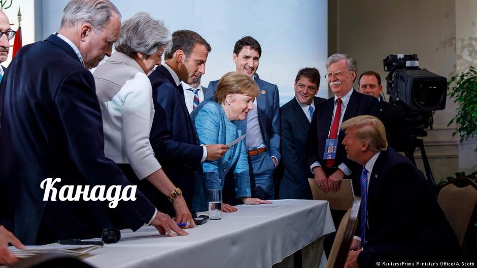 Фото лидеров стран «Большой семёрки», сделанное немецким фотографом Йеско Дензелем на саммите в Канаде, мгновенно стало вирусным. Кадр был опубликован в официальном инстаграме канцлера Германии Ангелы Меркель, позже его распространили ведущие мировые СМИ, а пользователи соцсетей нарисовали сотни фотожаб.