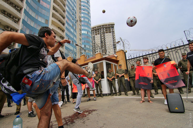 Участники акции облили футбольные мячи красной жидкостью и перебросили их через забор дипломатической миссии, символически забив голы в "ворота Российской Федерации".