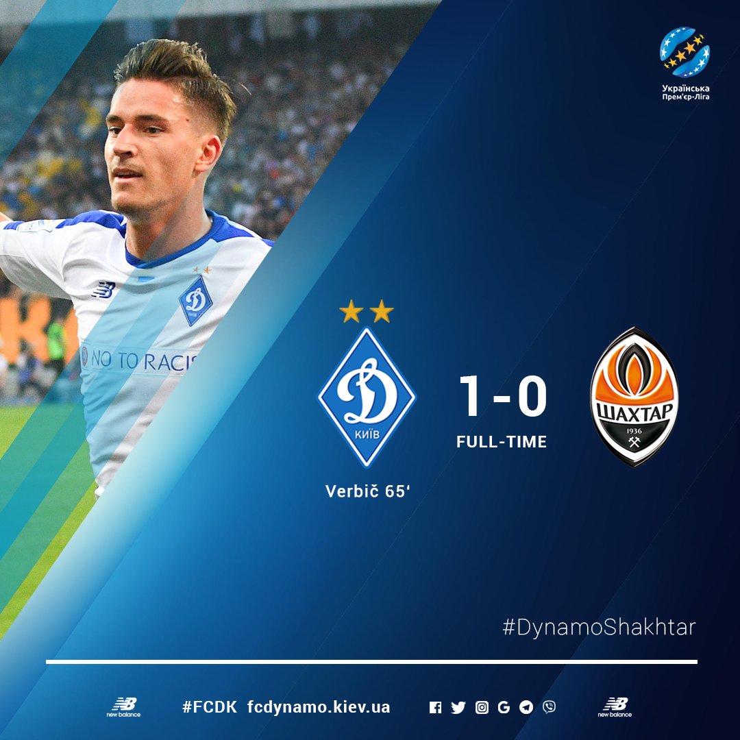 В центральном матче первого круга чемпионата Украины по футболу киевское "Динамо" минимально обыграло донецкий "Шахтер". Единственный гол на 65-й минуте после розыгрыша стандарта забил Беньямин Вербич.