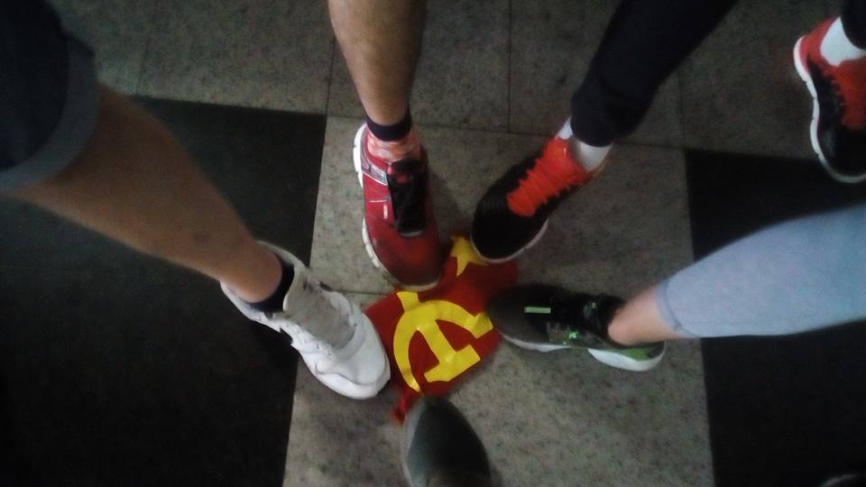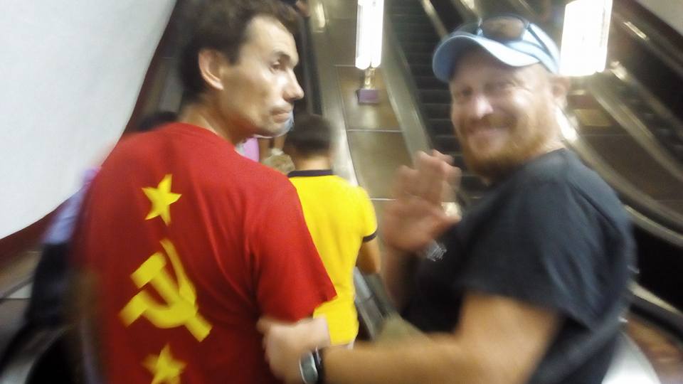 Двоих мужчин заметили на станции метро "Вокзальная". Один из них носил красную футболку с изображением серпа и молота. Оказалось, что он гражданин Словении, а его друг предупреждал его о последствиях такого решения. Об этом рассказал Руслан Сергиян на своей странице в Facebook.