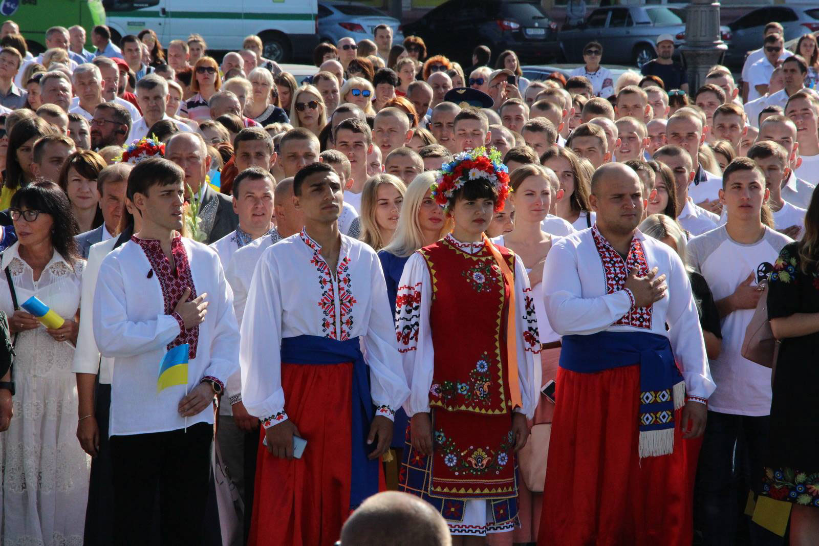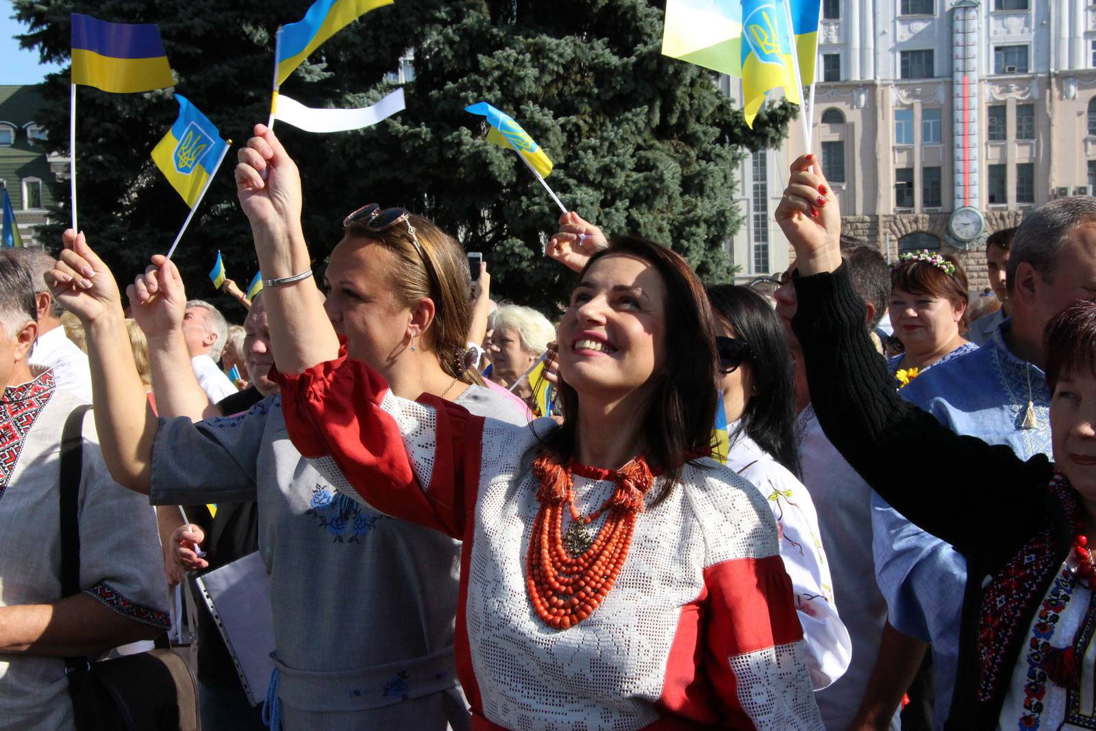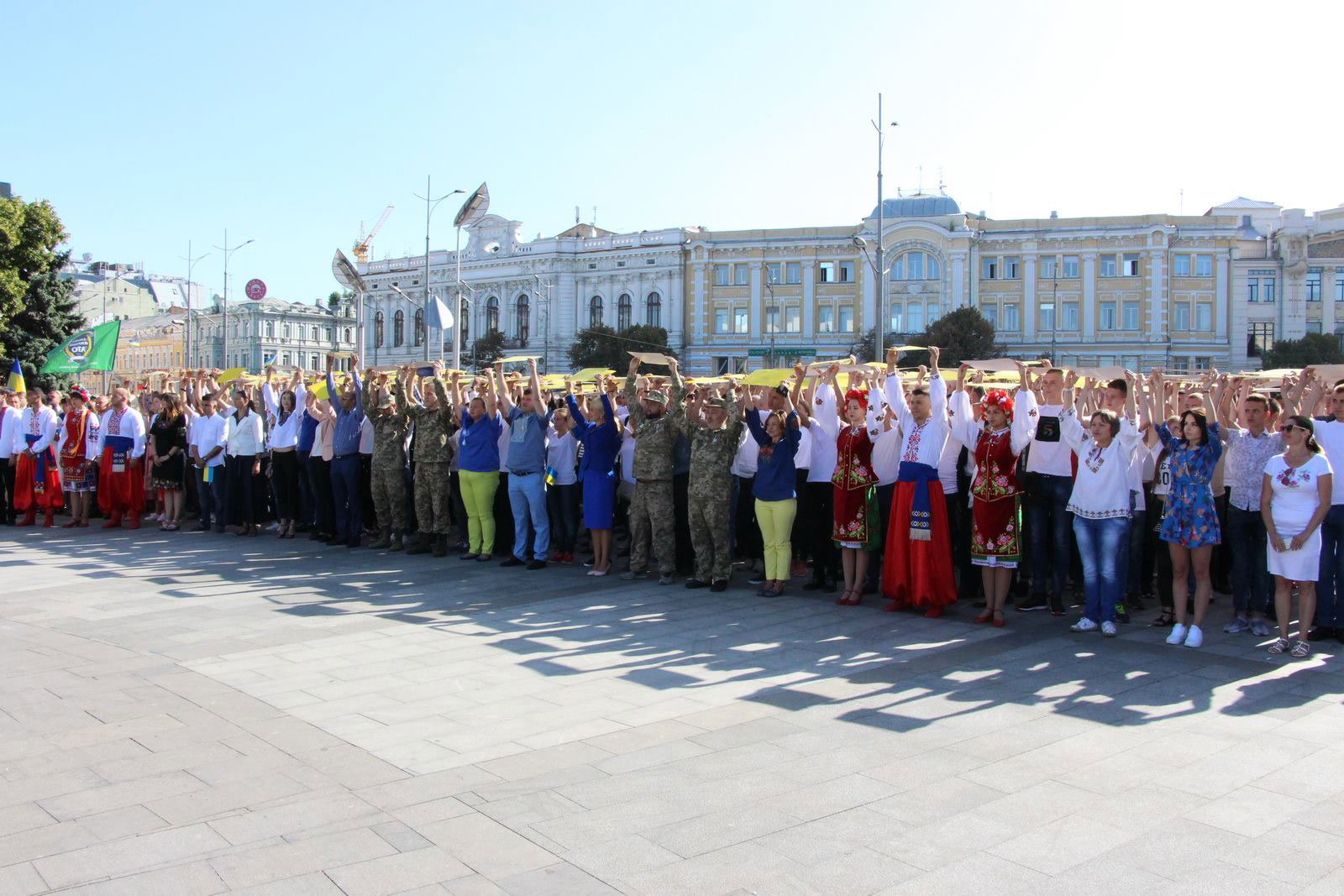 В честь праздника более 700 человек приняли участие во флэщмобе – они подняли вверх разноцветную бумагу и создали на фоне флага Украины сердце с буквами UA.