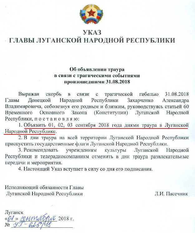 Кроме того своим "указом" Пасечник объявил трехдневный траур по своему донецкому сообщнику.
