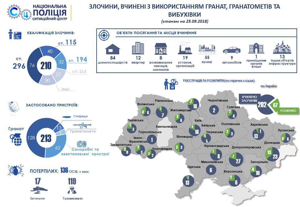 Украине с начала этого года погибли 17 человек в результате преступлений, совершенных с использованием гранат, гранатометов и взрывчатки. Соответствующую информацию обнародовал на своей странице в Facebook начальник Департамента патрульной полиции Евгений Жуков:
