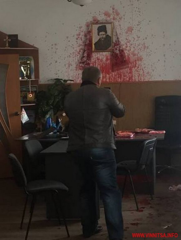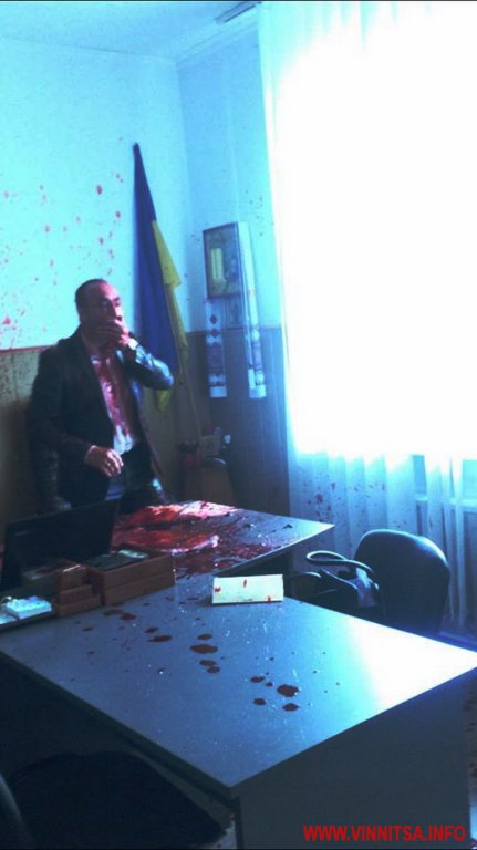 В городе Гнивань, который в 15 километрах от Винницы, неизвестные вломились в кабинет городского головы Владимира Кулешова и облили его кровью.