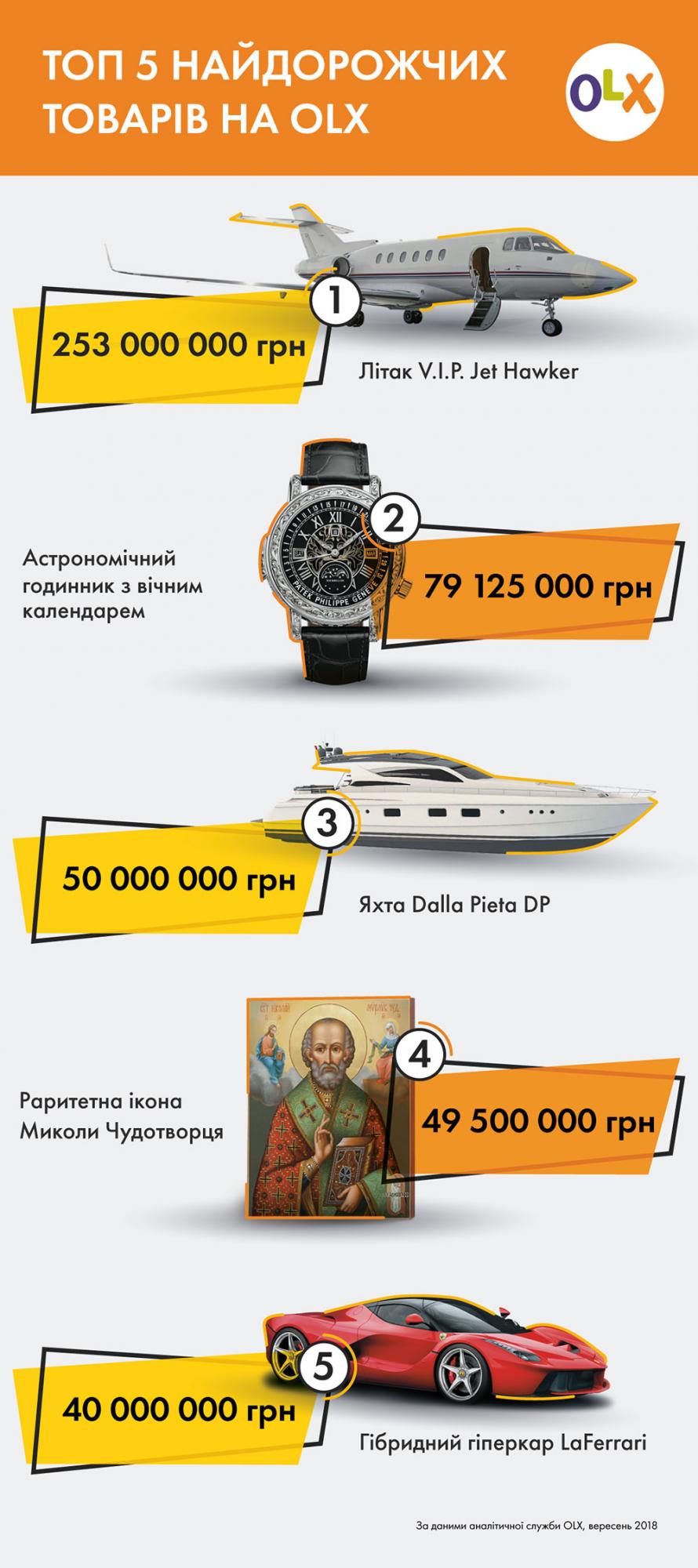 253 млн грн — самолет V.I.P Jet Hawker; 79 млн грн — астрономические часы с вечным календарем; 50 млн грн — яхта Dalla Pieta DP; 49 млн грн — раритетная икона Николая Чудотворца; 40 млн грн — гибридный гиперкар LaFerrari.Также в OLX сгруппировали самые дорогие лоты в отдельных категориях. Так, в секции "Электроника" первое место заняла акустическая система от американского бренда Steinway & Sons.