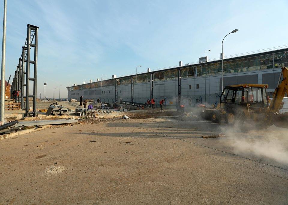 Около терминала D «Укрзализныця» построила две платформы длиной 114 метров для приема поездов. Сейчас строители укладывают на них покрытие из гранитных плит и начали возведение накрытия.