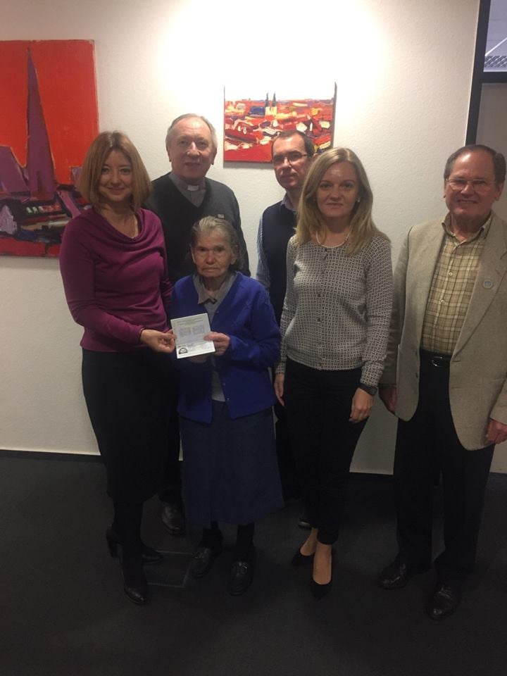 Ми познайомилися з пані Марією 8 травня 2015 року на центральному цвинтарі Франкфурта-на-Майні під час покладання квітів загиблим під час другої світової війни примусовим працівникам. Потім зустрічали її в церкві. Вона і її син, пан Микола, розповіли зворушливу історію про те, як пані Марія 16-річною дівчиною потрапила до Німеччини на примусові роботи, як тяжко працювала і ховала від господаря травму, щоб не відіслав її до концтабору, як хотіла вернутися після закінчення війни додому, але випадково дізналася про те, що українців із західних регіонів відправляють відразу в Сибір, і що єдиний наявний у неї документ – підтвердження Греко-католицьким парохіяльним Урядом в Завою (написання збережено в оригіналі) про її походження – врятував її від страшної долі багатьох українців, які мусили після каторжних робіт в Німеччині пройти концтабори в радянському Сибіру. Так сталося, що пані Марія так і залишилася в Німеччині, але набувати німецьке громадянство категорично відмовилася, натомість мала як на мене унікальний документ – посвідчення особи без батьківщини. Саме так, не посвідчення особи без громадянства, а посвідчення особи без батьківщини.