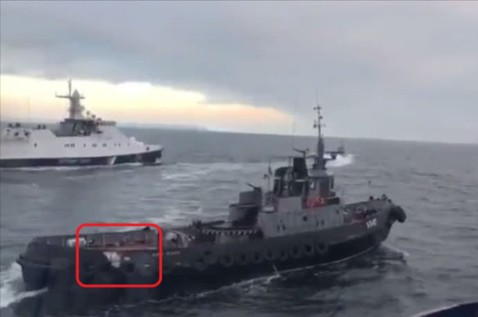 Из этой записи видно, что российский корабль "Дон" (отличительная черта - 30-мм пулемет, видимый в кадре, который также присутствует на более ранних фотографиях корабля), в течении часа после восхода солнца (восход солнца 25 ноября в этом районе был в 7:46) в третий раз протаранил буксир. Кроме того, в видеоролике голос (командир "Дона") кричит "восемь двадцать один" сразу после столкновения.
