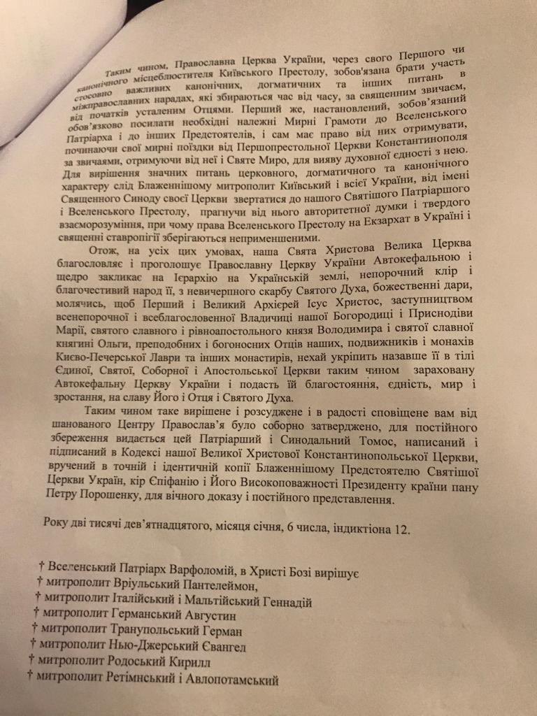Об этом говорится в тексте Томоса об автокефалии Православной церкви Украины, который опубликовал посол Украины в Турции Андрей Сибига в Тwitter.